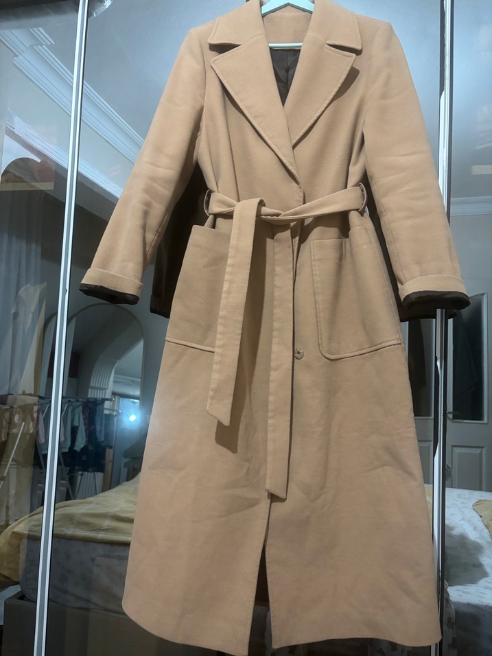 Bej süet kaşe , kemerli ve uzun kollu kadın kabanı. Notlu yaka ve uzun boyu ile klasik ve günlük kullanıma uygun 40 bedendir 38-40 ıle uyumludur sayılı kullandım sıfırdan farksız olcay mağazasından almışım