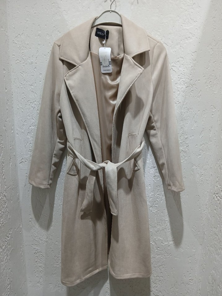 Bej süet kumaştan kemerli, uzun ve cepli, yakası kesik detaylı kadın trençkot. Ofis için uygun, günlük şık tarzda uzun kollu model.