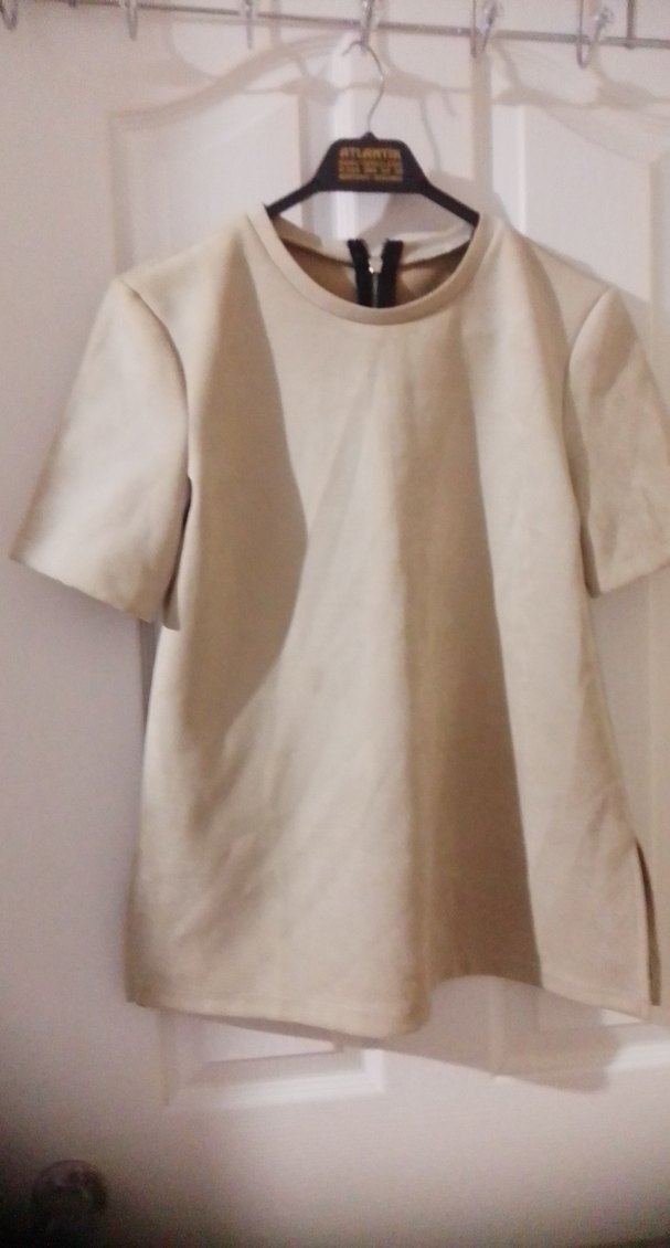 Bej süet kumaştan, kısa kollu, yuvarlak yakalı kadın tişörtü. Düz ve midi boyda, günlük sokak stili için sade ve rahat bir seçimdir.