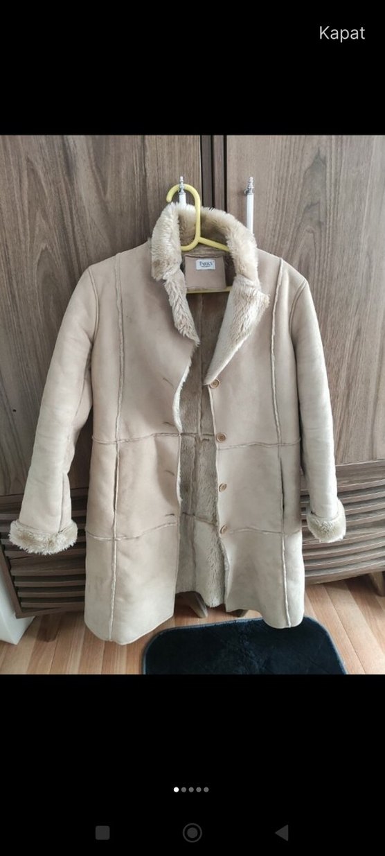 Bej süet kumaştan yapılmış, kürk detaylı ve kesik yaka özellikli midi uzunlukta kadın ceket. Rahat kesimi ve uzun kollarıyla günlük kullanıma uygundur.