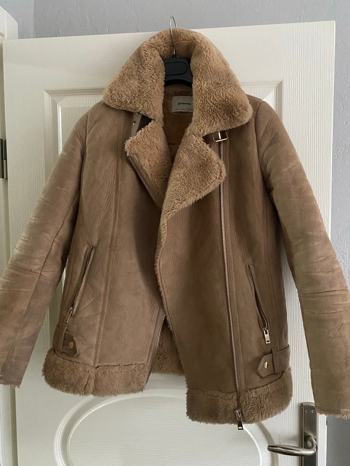 Bej süetten yapılmış, içi ve yakası kürklü biker ceket. Notlu yaka, normal kesim ve askılı kollara sahip, rahat ve şık bir parça. S-M bedene uygun. Sadece fermuarı bozuk onu da fiyata yansıttım.
