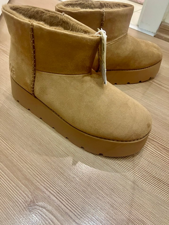 Bej süet malzemeden yapılmış, dolgu topuklu kadın botları. İç kısmı kürklü olup sıcaklık ve konfor sağlar. Pastel renkli, desensiz ve gündelik kullanıma uygun.