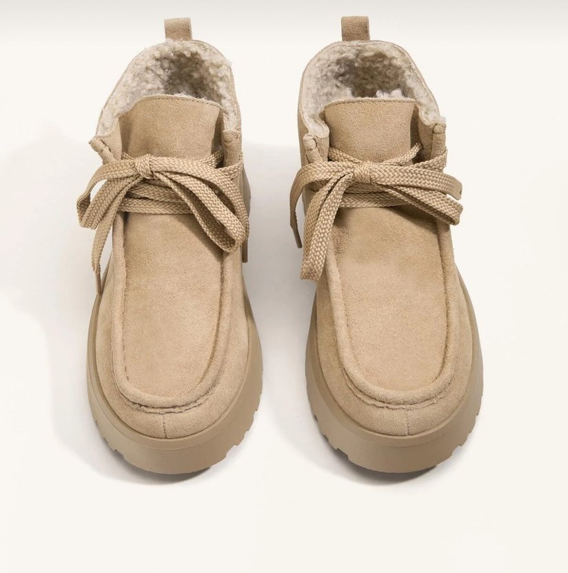 Bej süet malzemeden yapılmış, kürklü detaylı ve günlük kullanıma uygun rahat ve şık bir tasarıma sahiptir.