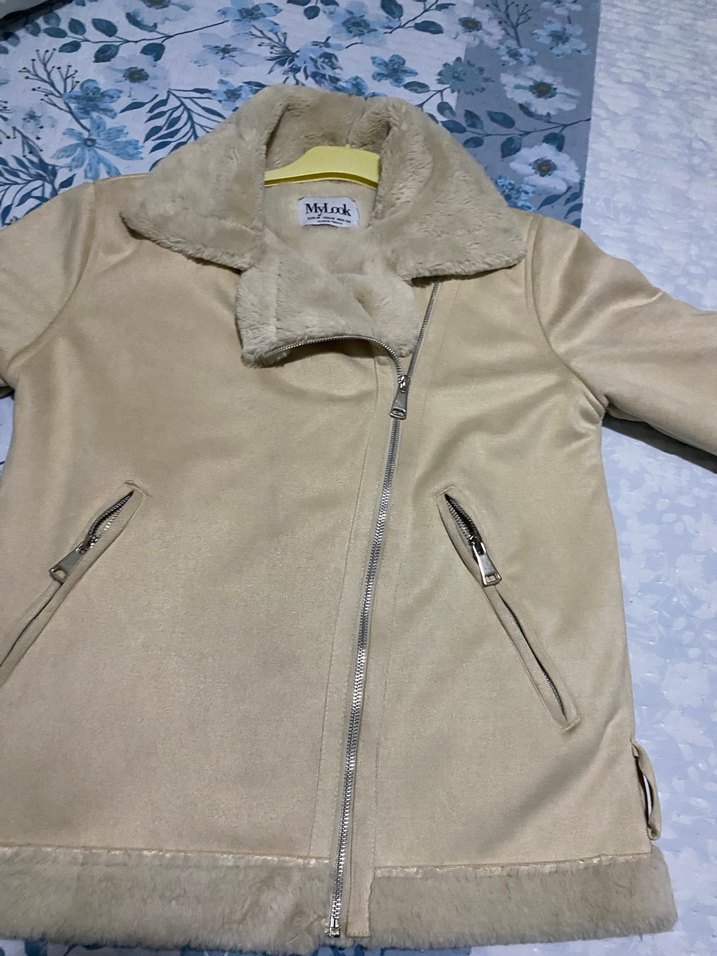 Bej süet kumaştan yapılmış, kürklü detaylı, kesilmiş yaka ve dar kesime sahip kadın ceketi. Uzun kollu, normal midi boyda, desen içermeyen günlük sokak giyimine uygun model.