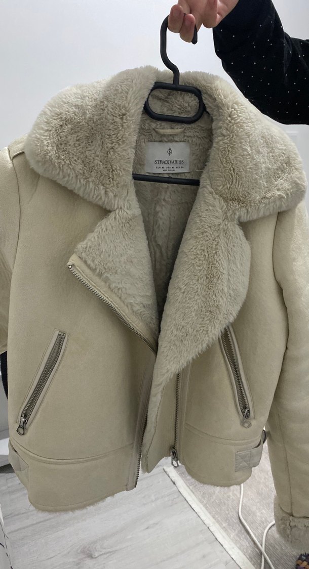Bej süet malzemeden, kürk detaylı, kesik yaka ve fermuarlı ceplere sahip, midi boy fitted kadın ceket. Rahat ve şık sokak stili için ideal.