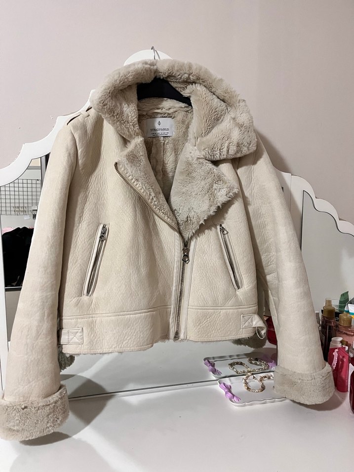 Bej süet kumaştan yapılmış, kürk detaylı, uzun kollu, yakalı ve fitted kesime sahip kadın ceket. Günlük kullanıma uygun, sokak stilinde bir parça.ürün bir iki kez giyildi