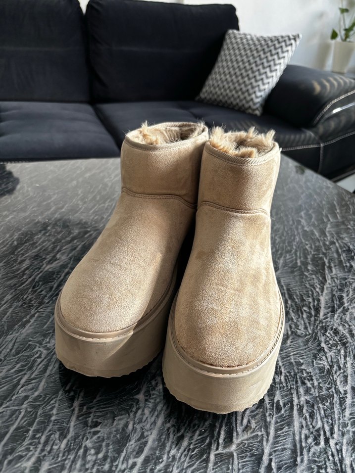 Bej süet kadın botları, kürk detaylı ve dolgu topuklu tasarımıyla konforlu ve şık bir görünüm sunar.