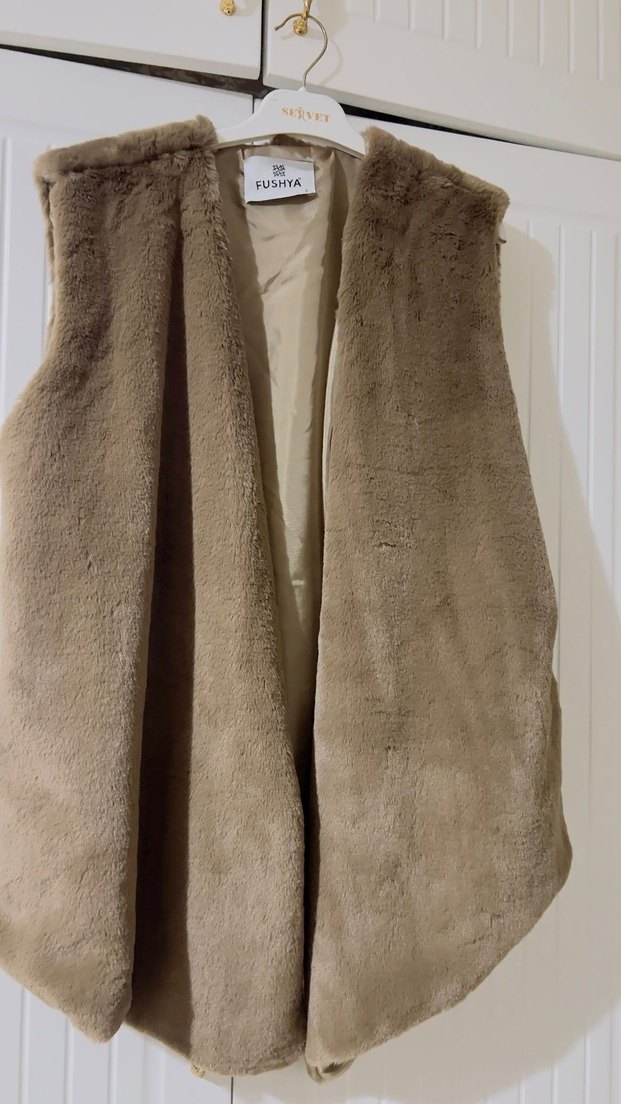 Bej süet, kürklü detaylı, kolsuz yelek. Normal uzunlukta, notched lapel yaka ve bol kesimle rahat bir kullanım sunar. Marka: FUSHYA.