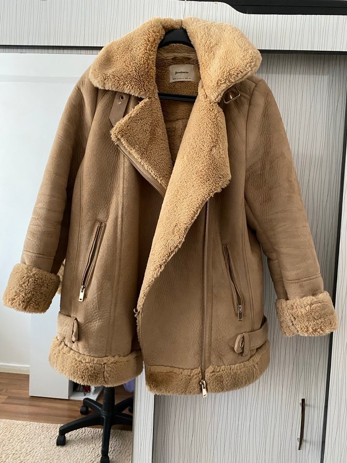Bej süet kumaştan, kürklü detaylı, notalı yaka ve bol kesim midi uzunluğunda kadın ceket. Rahat ve şık, günlük kullanıma uygun. Yaka kısmındaki kemerinde minicik bir deforme var. Defo bile sayılmaz. Görsellerde belirttim. Onun dışında üründe hiçbir deforme vs yoktur. Yeni gibidir.