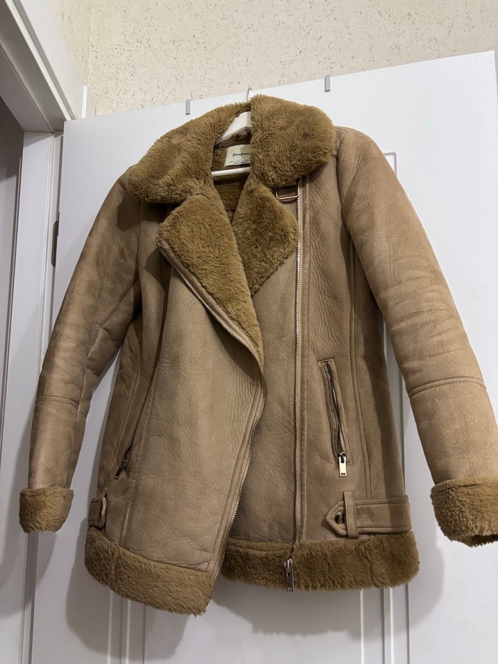 Bej süet ceket, kürk detaylı, fitted kesim ve yakalıdır. Midi boyda ve askılı kolludur, günlük sokak stili için uygundur.