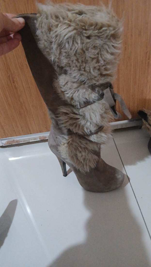 Bej süet malzemeden yapılmış, kürk detaylı ve yüksek topuklu diz boyu kadın çizmesi. Bohem tarzıyla şık ve rahat bir görünüm sunar.