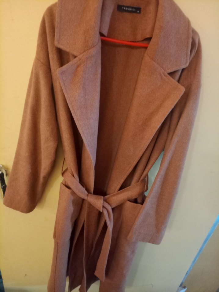 Bej renkte süet kumaştan, kuşaklı ve geniş yakalı midi uzunlukta, rahat kesim kadın kaban. S beden ama geniş kalıp