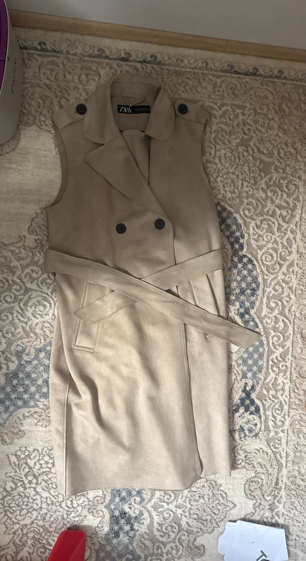 Bej süet kumaş kuşaklı ve uzun kesim kadın yeleği. Kolsuz, yakalı ve desen içermeyen tasarımıyla gündelik ve sokak stiline uygundur. XS olmasına bakmayın ben s giyorum m ye de xs s ye de olur hatta l bile olur aldım zaranın kendi sitesinden sonra giyerm dedm hiç giymedim kaldı öyle alana hayırlı olsn