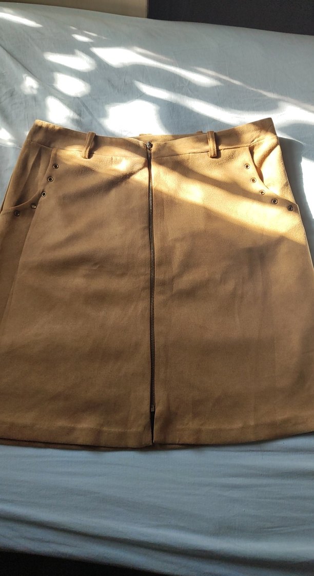 Bej süet kumaştan, fermuarlı, normal boyda, midi kesim ve vücuda oturan hamile eteği. Minimalist ve günlük kullanıma uygun. fermuar ucu yok sadece resimde belirtildi