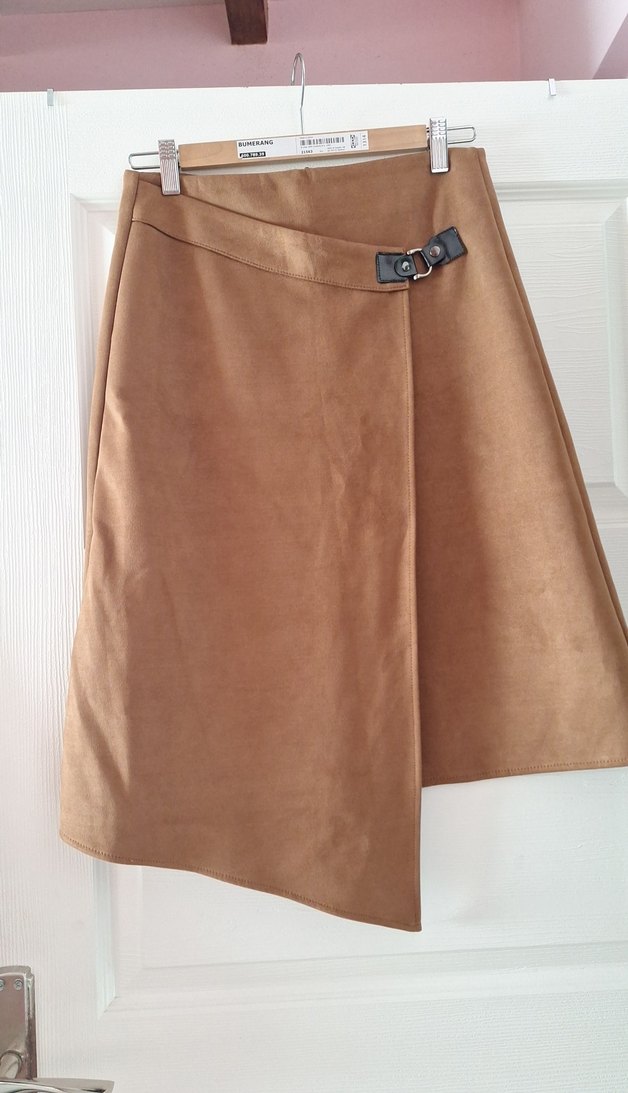 Bej süet kumaştan, kemerli ve bol kesim hamile eteği. Parlak yüzeyi ve midi boyu ile ofis ortamına uygundur.