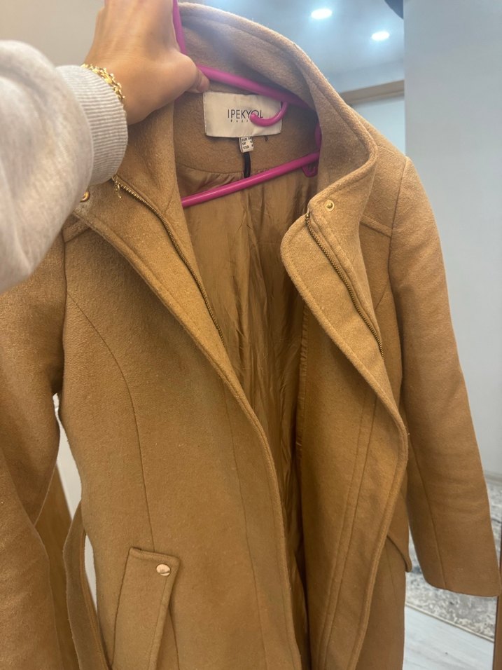 Bej süet kaban, çıtçıtlı cepler ve fermuarlı ön kapama ile rahat ve şık. Uzun kollu, diz boyu ve desen içermeyen modeli günlük kullanıma uygundur. IPEKYOlmarkalıdır.
