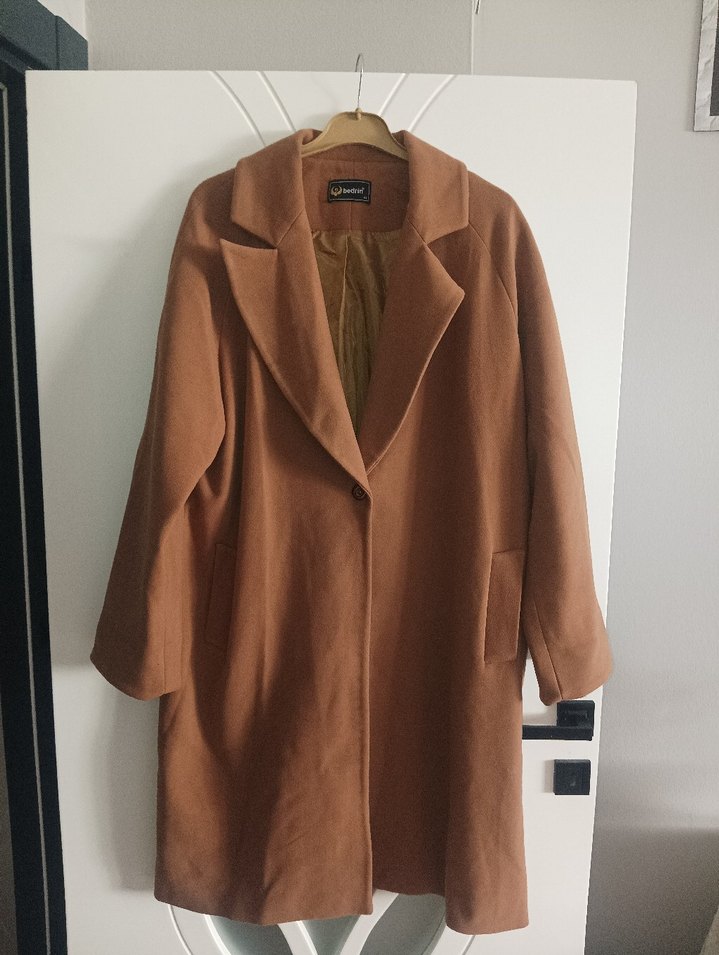 Bej süet kumaştan, normal boy midi uzunlukta, yakası kesik ve düz desensiz uzun kollu kadın kaban. Günlük kullanıma uygun, rahat ve şık bir görünüme sahip.