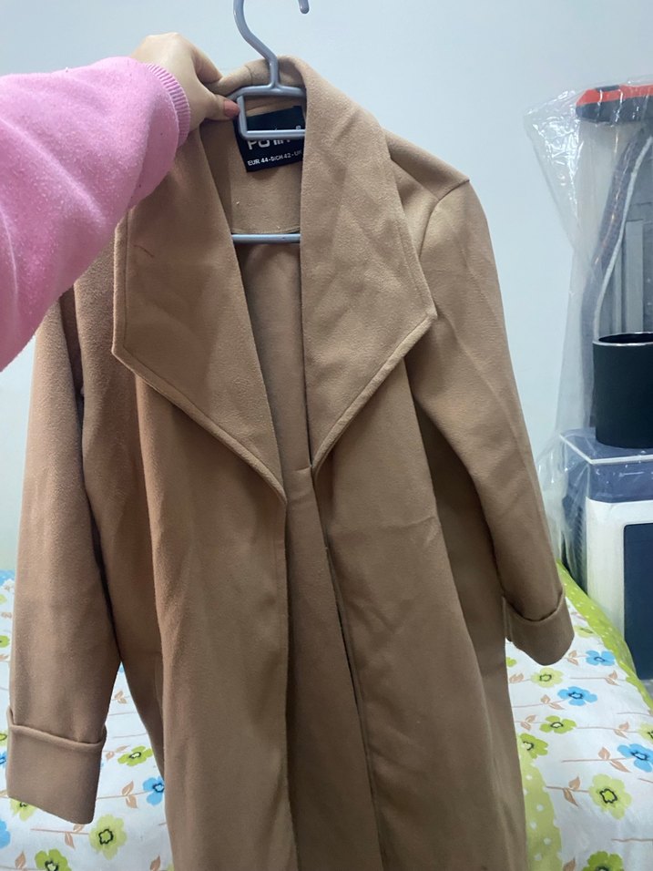 Bej süet kumaştan, düğmeli, notched lapel yakalı, bol kesim, uzun kollu midi kadın kaban. Minimalist ve pastel renkte, gündelik kullanıma uygun.
