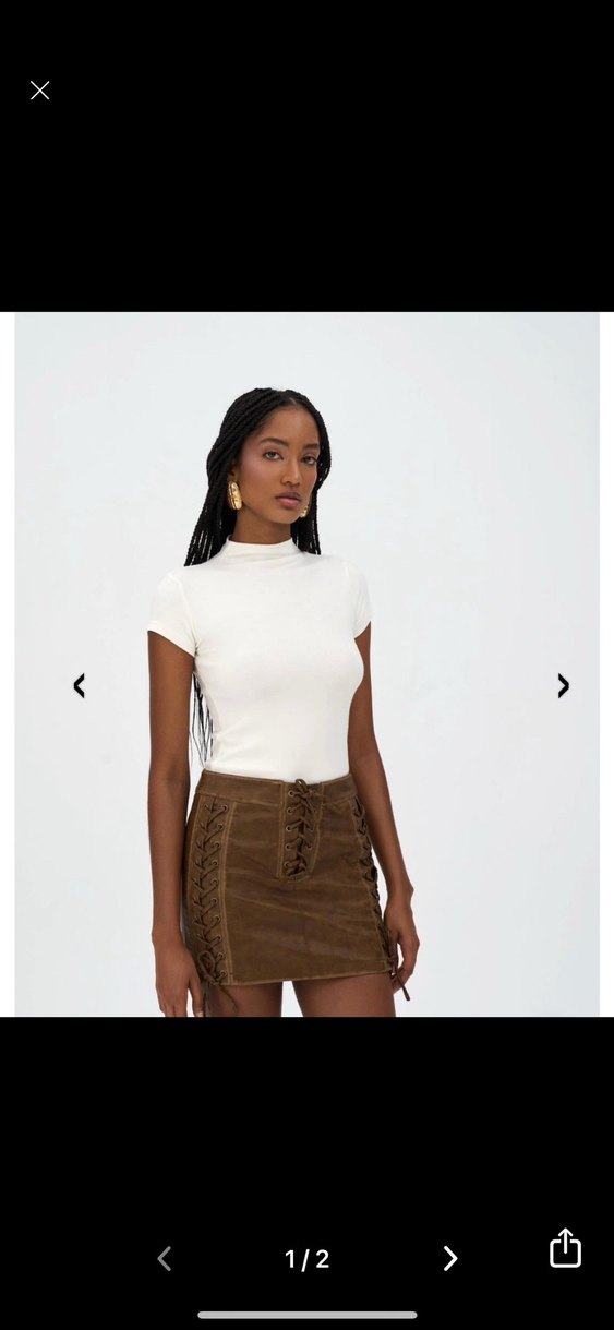 Bej süet kumaştan, yanları bağcıklı, dar kesim mini etek. Trendy ve rahat bir stil için uygundur. ✨