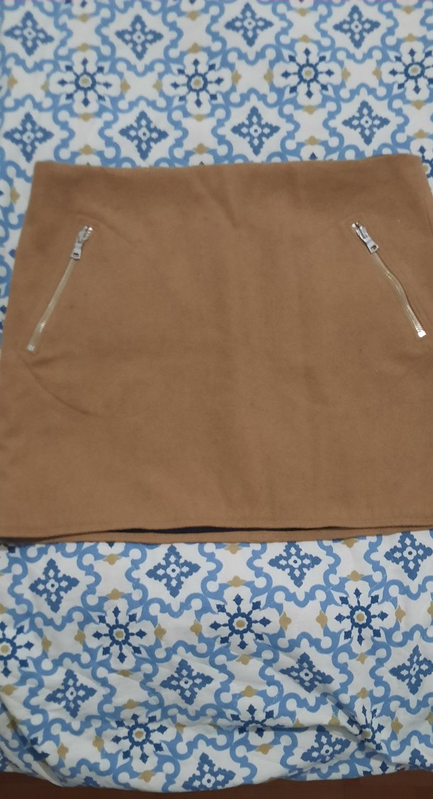 Bej süet mini etek, normal kesim ve fermuarlı ceplerle. Minimalist, streetwear tarzında, günlük kullanıma uygun. ✨ tam kışlık bi etek 42bedenede olur
