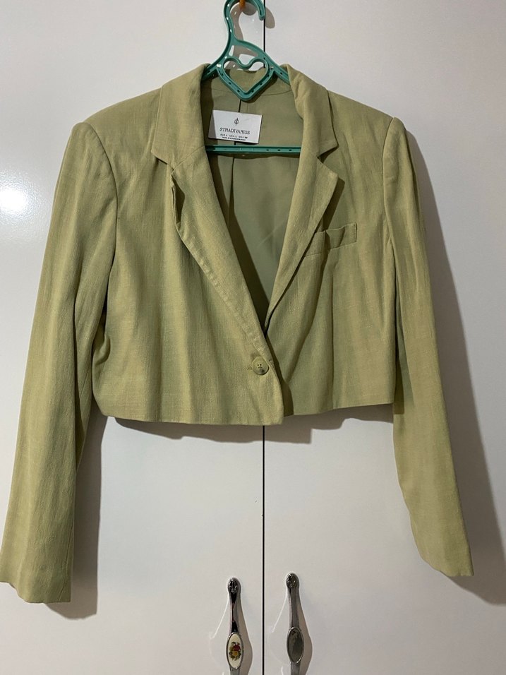 Pastel bej keten kumaştan, düğmeli, uzun kollu, mini uzunlukta, regular fit kadın blazer ceket. Ofis ve günlük şıklık için uygun.