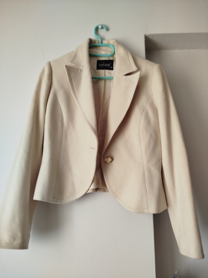 Bej kaşmir kumaştan mini uzunlukta, düğmeli,erkek yakalı kadın blazer ceket. Uzun kollu ve desensiz, modern klasik ofis stiline uygun. bej rengi hiç kusuru yok astarlı etek