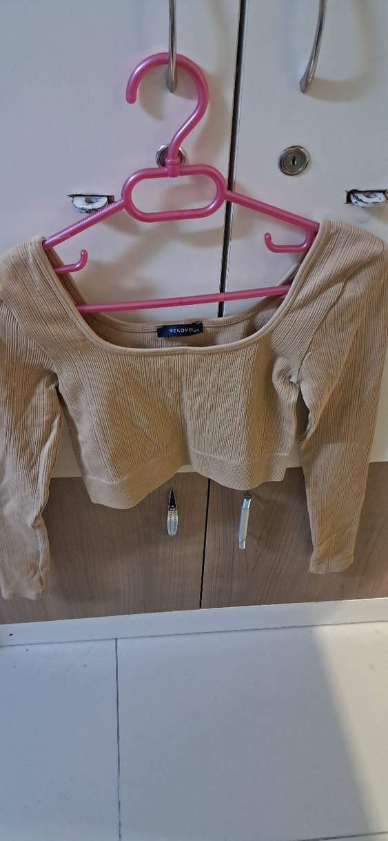 Bej süet kumaştan yapılmış, kısa ve vücuda oturan kesime sahip kadın bluzdur. Uzun kollu ve kayık yaka tasarımı ile rahat ve şık bir görünüm sunar. Günlük sokak modasına uygundur. hiç giyilmedi temizdir