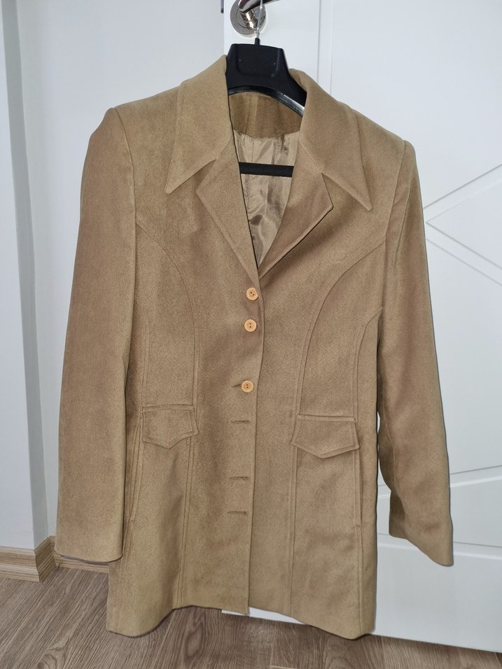 Bej süet malzemeden yapılmış, kürk detaylı, kısa boy ve regular fit kadın kaban. Uzun kollu, yakası kesik ve desensiz, ofis için uygun. hiç bir defosu yok temiz gönderim olacaktır ürün zara değil bilginize