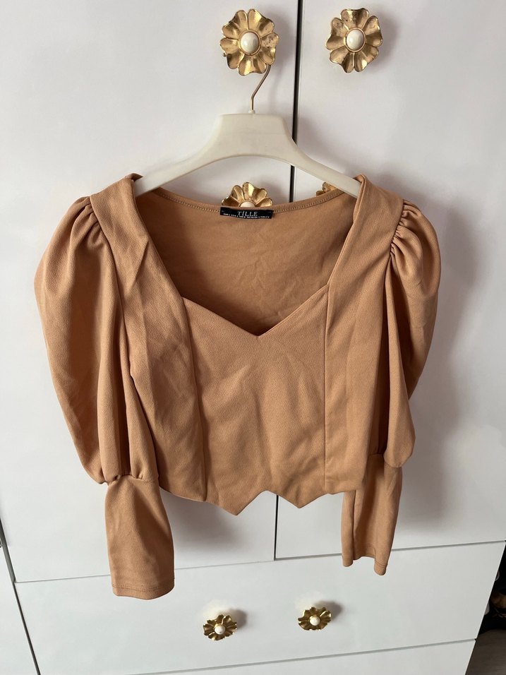 Bej süet kumaştan yapılmış, V yaka ve uzun balon kollu, mini boy, düğmeli ve vücuda oturan bluz. Günlük şık sokak modasına uygun.