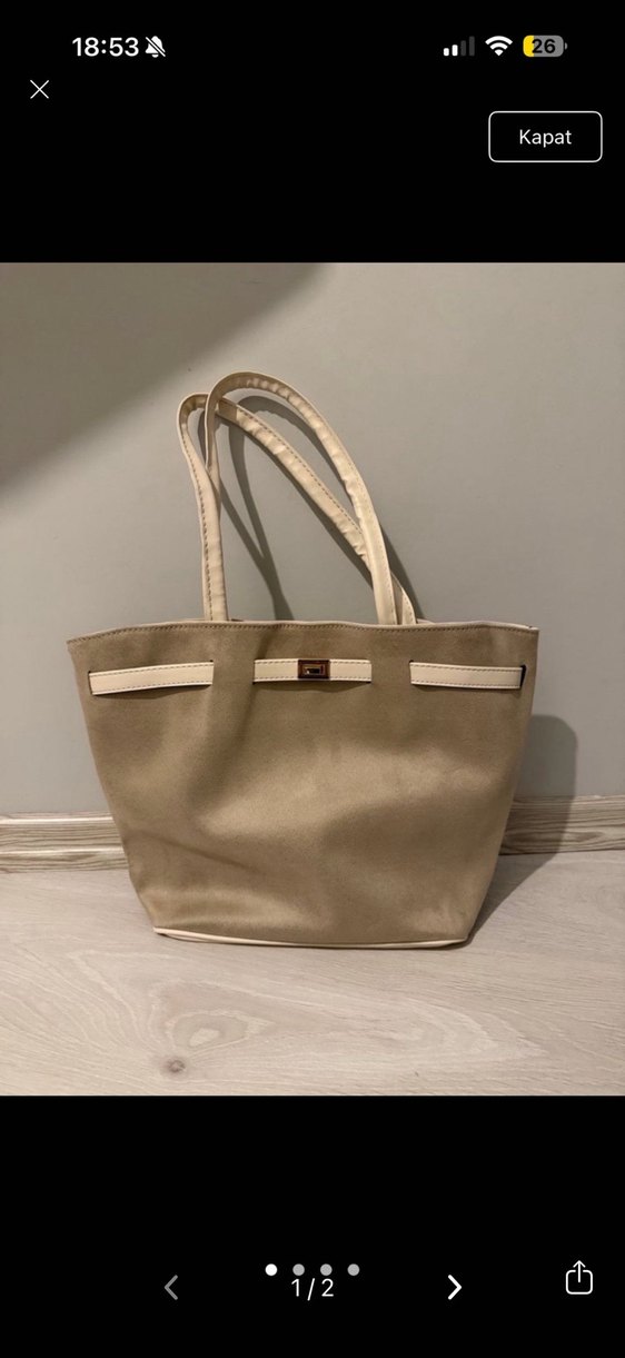 Bej süet kadın çanta, kemerli detaylı ve modern klasik tarzda, günlük kullanım için uygundur. Düz yüzeyi ve uzun sapları vardır. Çanta sıfırdır