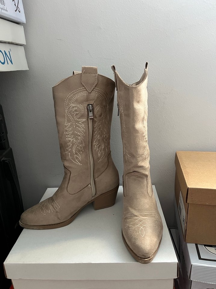 Bej süet malzemeden, yüksek topuklu, nakış detaylı ve tokalı bohem tarzı kadın çizmesi.