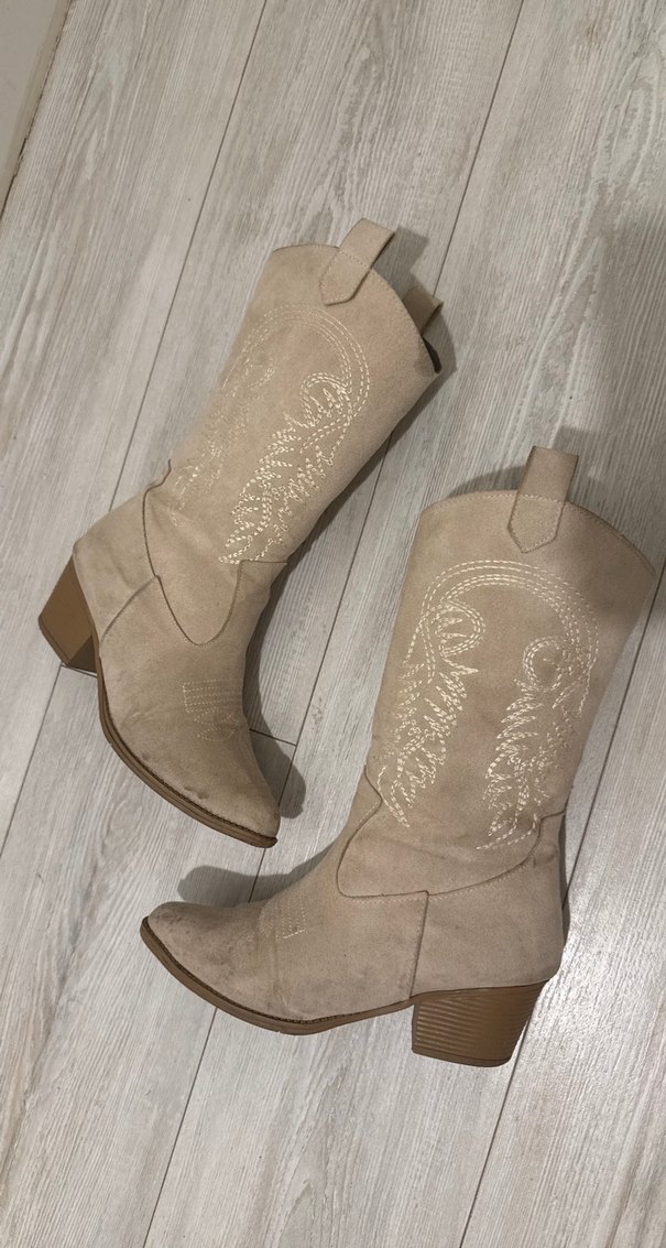 Bej süet diz boyu nakışlı çizme, blok topuklu ve bağcıklı. Bohem tarzıyla günlük kullanım için uygun.