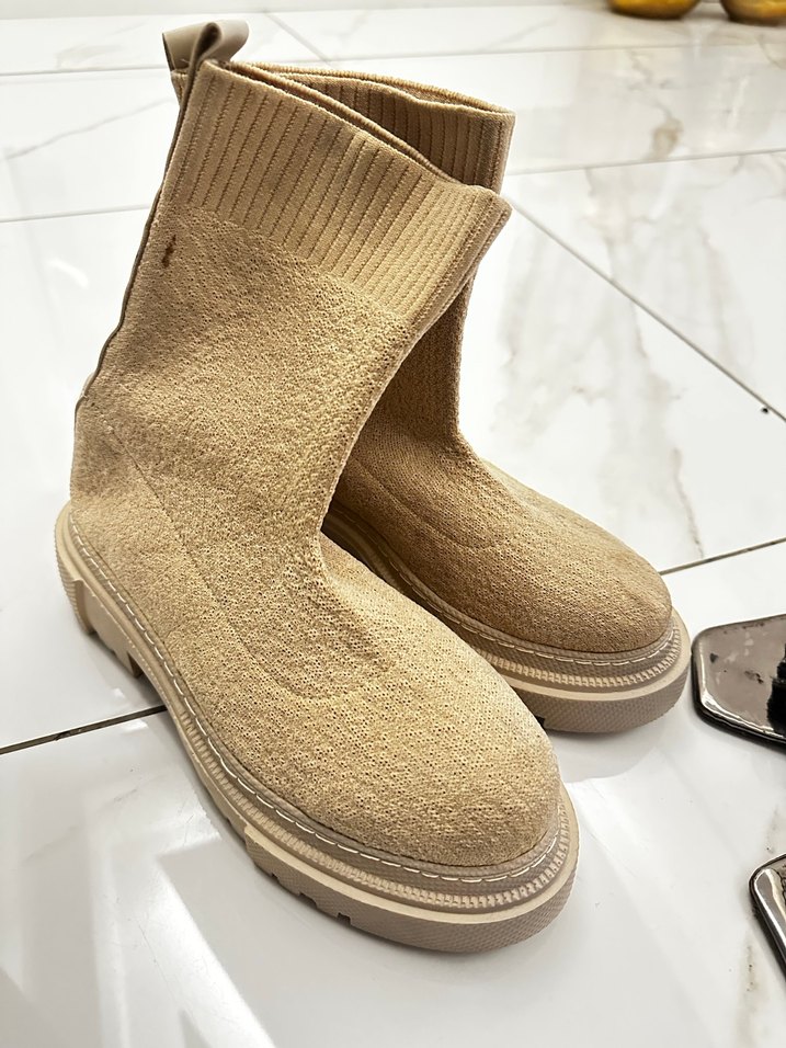 Bej süet malzeme ve örgü detaylı, dolgu topuklu kadın botları, gündelik kullanıma uygun rahat ve şık tasarım sunar.