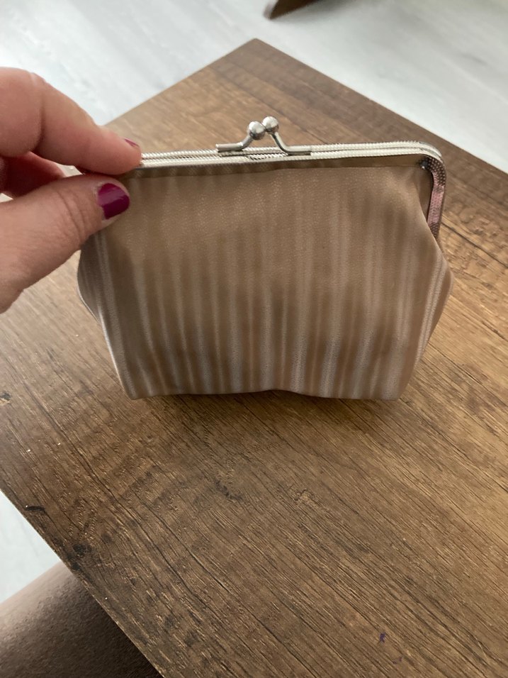Bej süet pilili kadın portföy cüzdan, metal çıtçıt kapama ve yumuşak dokulu, hafif gri tonlarda. Günlük kullanım için uygundur.