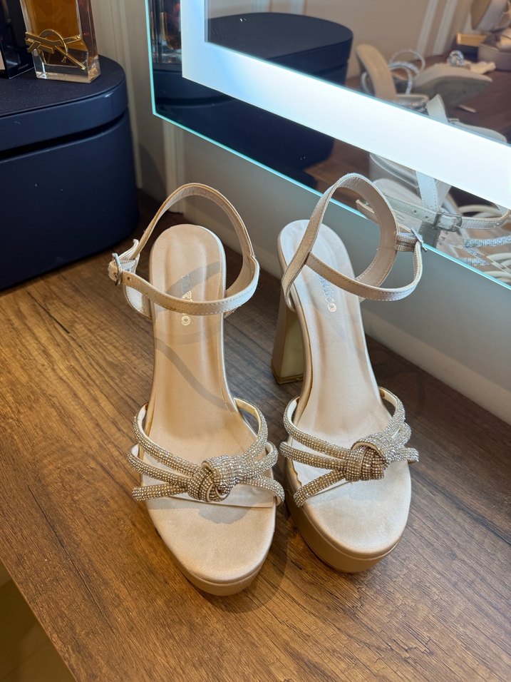 Bej süet platform topuklu, tokalı bilekten bağlamalı kadın abiye ayakkabı. Minimalist ve çağdaş tarza uygun, hafif yılan desenli detaylar içerir.