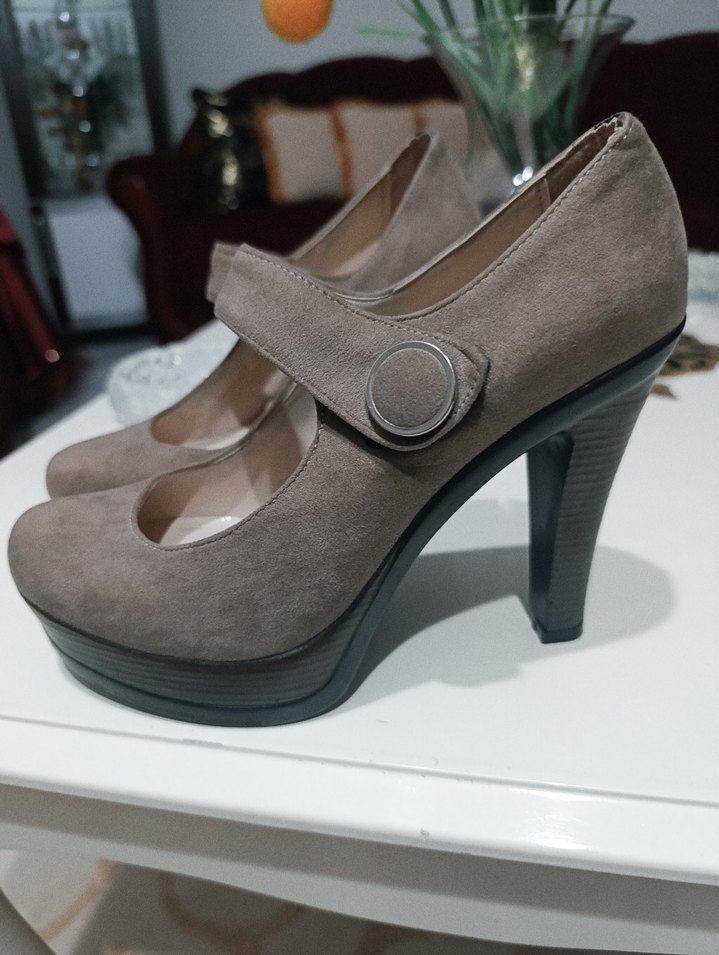 Bej süet platform topuklu ayakkabılar, tokalı kayış ve çağdaş tasarım ile günlük kullanıma uygundur. trend günlük stile ince bir detay katar.