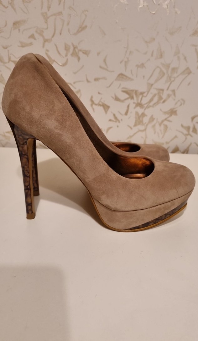 Bej süet stilettolar, yılan desenli topuk ve kürk detaylarıyla klasik ve minimalist tarzı bir araya getiriyor. Romantik akşamlar için ideal.