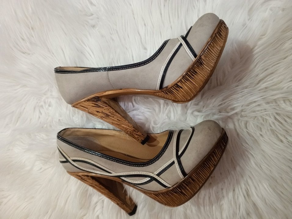 Bej süet stiletto, platform topuklu ve zebra desenli, tokalı detaylarla ofis için şık ve çağdaş Paris tarzını yansıtıyor.
