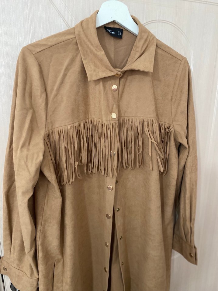 Bej süet kumaştan yapılmış, parlak görünümlü, düğmeli ve kesik yakalı gömlek. Uzun kollu, bol kesim ve ön kısmında püsküllü bohem tarzı. Günlük kullanım için uygun.
