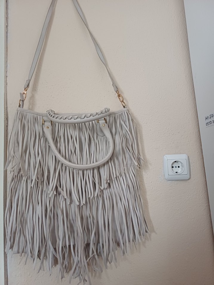 Bej süet malzemeden yapılmış, uzun püsküllere sahip bohem tarzda kadın çantası. Yumuşak dokulu ve günlük kullanıma uygun geniş tasarım. YURTDIŞINDAN alındı. Hiç kullanılmadı.