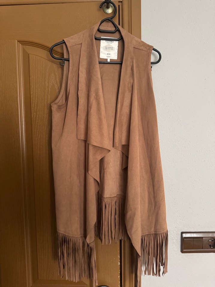 Bej süet kumaştan, püsküllü ve drapeli tasarıma sahip, notlu yakalı, bol kesim bohem tarzı yelek. Günlük kullanım için uygundur.