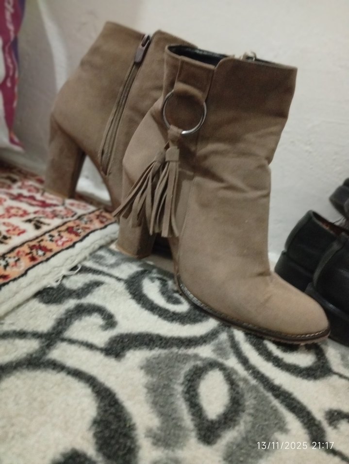 Bej süet malzemeden blok topuklu kadın bot, püskül detayıyla bohem ve trend görünüme sahip, günlük kullanıma uygun.