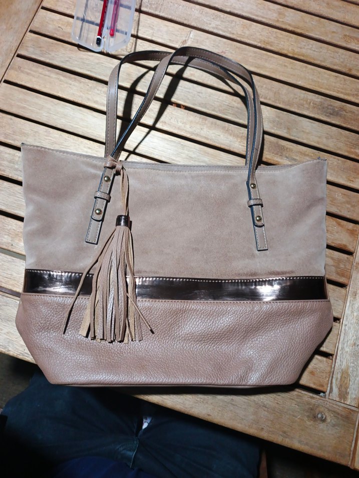 Bej süet malzemeden yapılmış alt kısım deri, püskül detaylı kadın çantası. Düz ve desen içermeyen tasarımı, modern görünüm için metalik şeritle tamamlanmıştır. Günlük kullanım için uygundur.