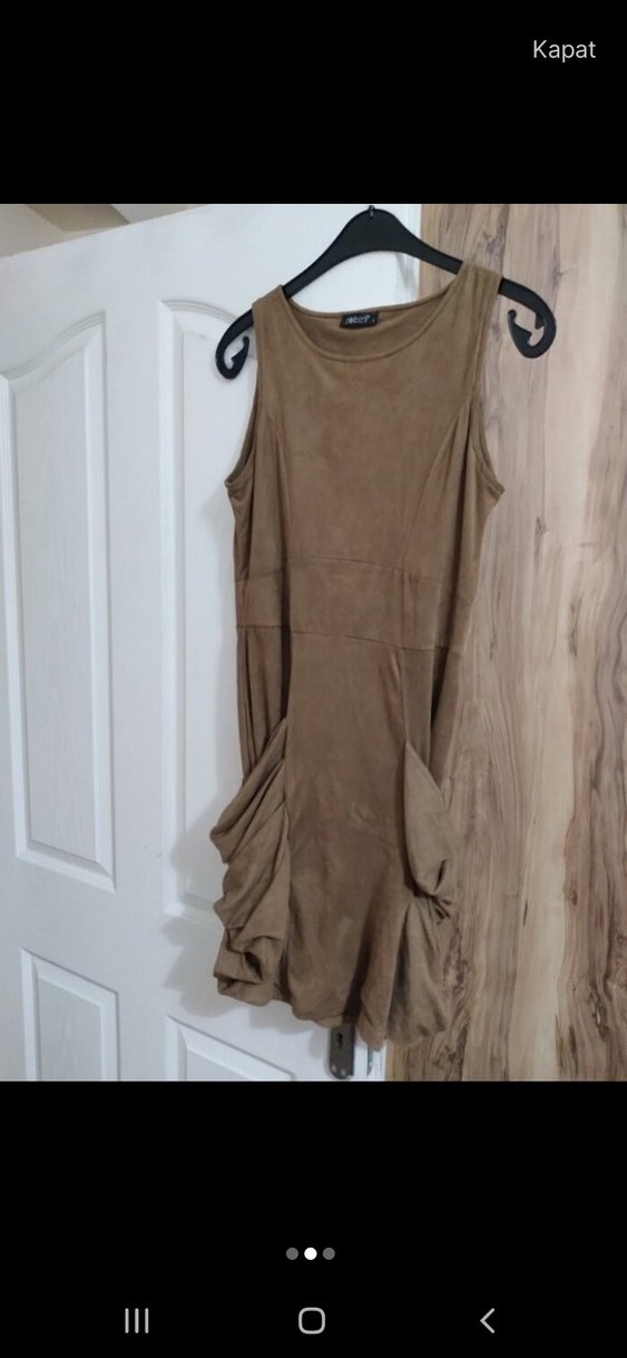 Bej süet kumaştan, kolsuz, salaş kesim midi elbise. Drapeli detaylarla ve yuvarlak yakalı, günlük sokak stiline uygun.