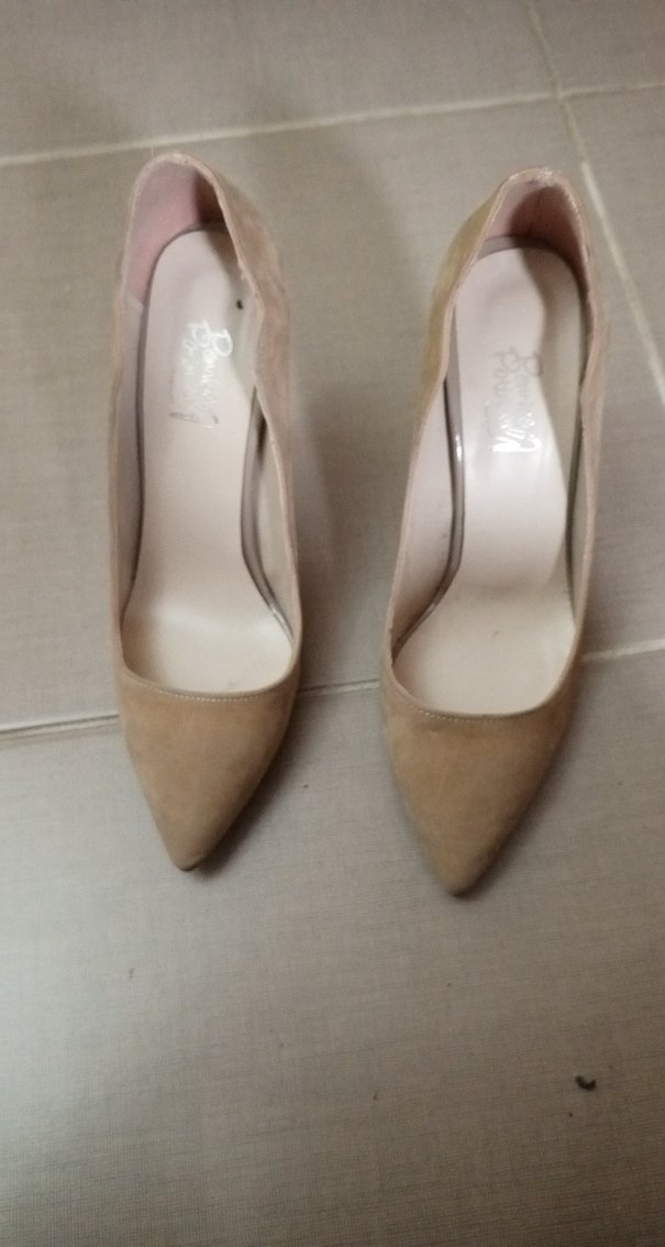Bej süet stilettolar, sivri burunlu ve düz yüzeyli, günlük şıklık için çağdaş ve minimalist bir görünüm sunar.