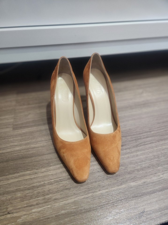 Bej süet malzemeden yapılmış, sivri burunlu minimal ve şık bir ofis stiletto topuklu ayakkabı. Modern tarzda, zahmetsiz şıklık sunar.