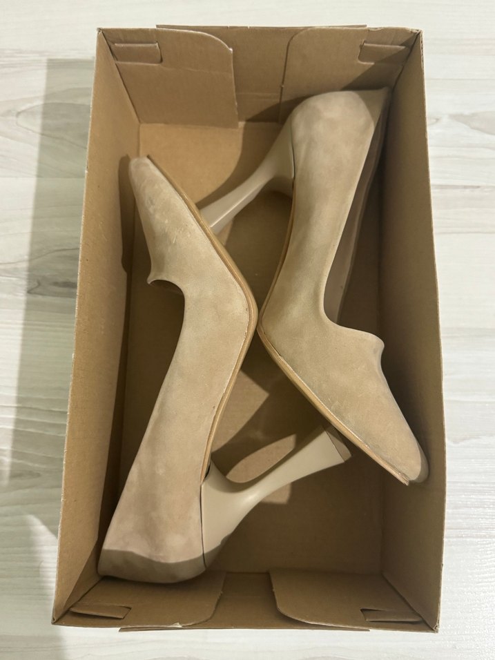 Bej süet malzemeden yapılmış, minimalist ve çağdaş stilettolar. Ofis için uygun, zahmetsiz şıklık sunar.