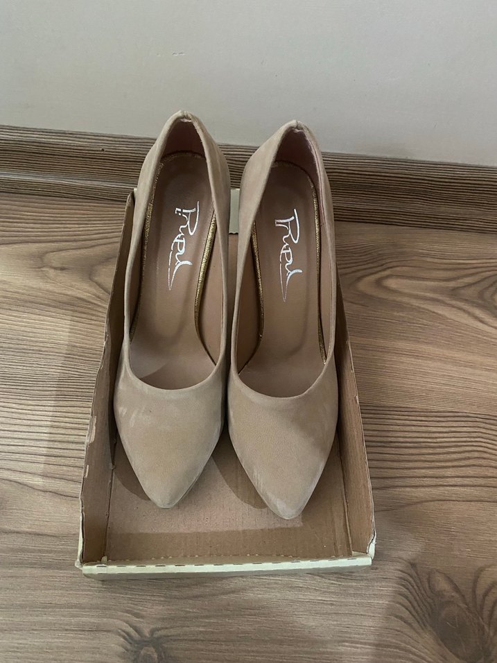 Bej süet malzemeden yapılmış, minimalist tasarımlı sivri burunlu stiletto topuklu ayakkabılar, ofis ve günlük şıklık için uygundur. Pastel tonlarda rahat bir stil sunar. 1 kez giyildi.35numara