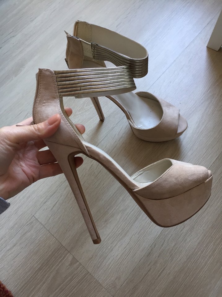 Bej süet malzemeden yapılmış,tokalı bantlı stiletto topukludur. Minimalist ve çağdaş tarzı birleştirir, romantik akşamlar için uygundur.