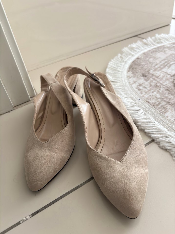 Bej süet malzemeden yapılmış, stiletto topuklu kadın ayakkabısı. Modern ve klasik Paris tarzını yansıtan, zahmetsiz şıklık sunar. Günlük kullanıma uygundur. 40 numara ama kalıbı küçük 39 numaraya olur.